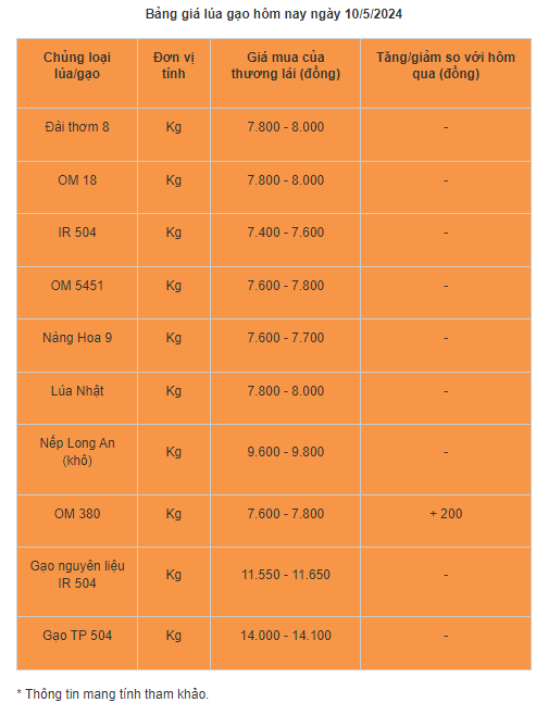 Giá lúa gạo hôm nay ngày 10/5 tại khu vực Đồng bằng sông Cửu Long duy trì ổn định với các mặt hàng. Riêng lúa OM 380 và cám khô điều chỉnh tăng mạnh.
