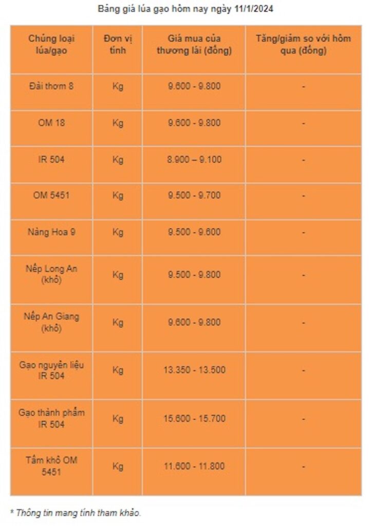 Với các loại lúa còn lại, giá đi ngang. Cụ thể, lúa Đài thơm 8 duy trì quanh mốc 9.600 – 9.800 đồng/kg; OM 18 ở mức 9.600 – 9.800 đồng/kg; OM 5451 ở mức 9.500 – 9.700 đồng/kg; Nàng Hoa 9 duy trì ổn định ở mức 9.500 – 9.600 đồng/kg; lúa OM 380 dao động quanh mốc 8.600 – 8.800 đồng/kg.