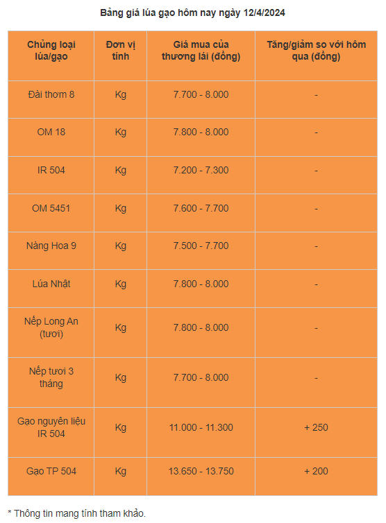 Cụ thể, theo cập nhật của Sở Nông nghiệp và Phát triển nông thôn tỉnh An Giang, lúa OM 18 ở mức 7.800 – 8.000 đồng/kg; OM 5451 ở mức 7.600 – 7.700 đồng/kg; nếp Long An tươi 7.800 – 8.000 đồng/kg; lúa Đài thơm 8 dao động quanh mốc 7.700 – 8.000 đồng/kg; IR 504 ở mức 7.200 – 7.300 đồng/kg; lúa Nàng Hoa 9 dao động quanh mốc 7.500 – 7.700 đồng/kg; lúa OM 380 duy trì ổn định quanh mức 7.500 – 7.600 đồng/kg