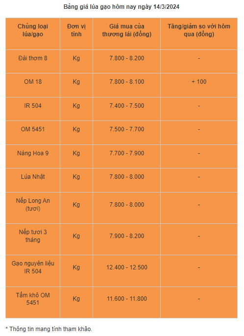 Cụ thể, theo cập nhật của Sở Nông nghiệp và Phát triển Nông thôn tỉnh An Giang, lúa Đài thơm 8 dao động quanh mốc 7.800 – 8.200 đồng/kg; OM 5451 ở mức 7.600 – 7.700 đồng/kg; Nàng Hoa 9 dao động quanh mốc 7.700 -7.900 đồng/kg; lúa OM 380 ở mức 7.500 đồng/kg; lúa IR 504 ở mức 7.400 – 7.500 đồng/kg. Riêng lúa OM 18 hôm nay tăng nhẹ 100 đồng/kg lên mức 7.800 – 8.100 đồng/kg.