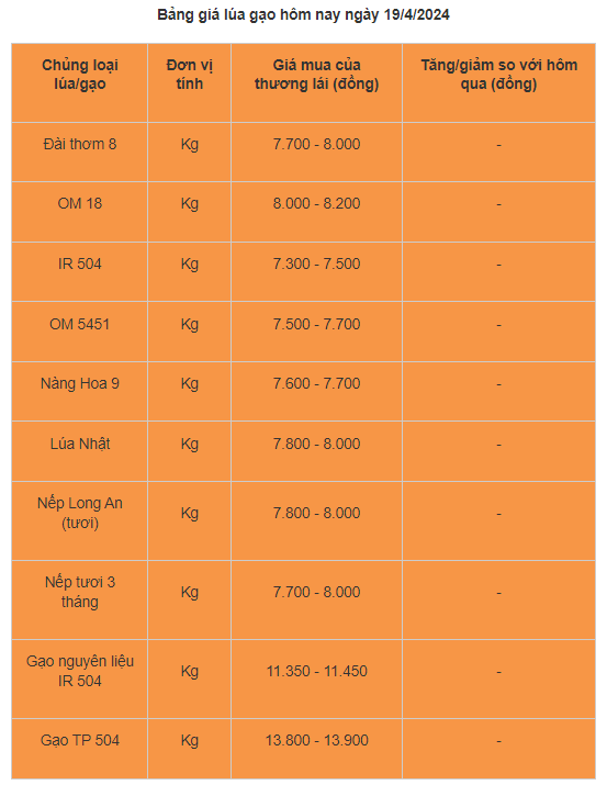 Giá lúa gạo hôm nay ngày 19/4 tại khu vực Đồng bằng sông Cửu Long hôm nay không biến động. Cuối vụ Đông xuân nguồn hàng ít, khó mua và được chào bán giá cao.