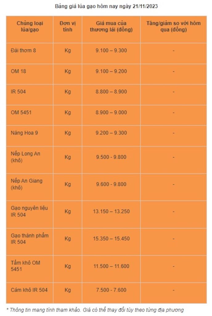 Theo đó, tại khu vực An Giang, cập nhật của Sở Nông nghiệp và Phát triển nông thôn tỉnh An Giang sáng 21/11 cho thấy, lúa Đài Thơm 8 dao động quanh mốc 9.100 – 9.300 đồng/kg; lúa IR 504 duy trì ổn định ở mức 8.700 – 8.900 đồng/kg; lúa OM 18 ở mức 9.100 – 9.200 đồng/kg Nàng hoa 9 ở mức 9.200 – 9.300 đồng/kg; lúa OM 18 ở mức 9.000 – 9.200 đồng/kg; OM 5451 dao động 8.900 – 9.000 đồng/kg; OM 380 dao động quanh mốc 8.600 – 8.800 đồng/kg.
