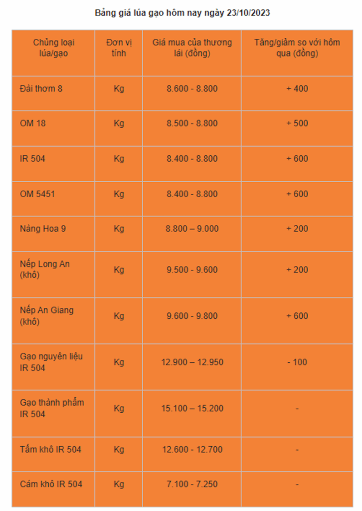 Tại khu vực An Giang, theo cập nhật của Sở Nông nghiệp và Phát triển nông thôn tỉnh An Giang, lúa Đài thơm 8 ở mức 8.600 – 8.800 đồng/kg, tăng 400 đồng/kg; OM 18 dao động quanh mốc 8.500 – 8.800 đồng/kg, tăng 500 đồng/kg; lúa Nàng Hoa 9 duy trì ở mức 8.800- 9.000 đồng/kg, tăng 200 đồng/kg; lúa IR 504 dao động quanh mốc 8.400 – 8.800 đồng/kg, tăng 400 – 600 đồng/kg; lúa OM 5451 dao động 8.400 – 8.800 đồng/kg, tăng 400 – 600 đồng/kg; lúa OM 18 ở mức 8.500 – 8.800 đồng/kg, tăng 700 đồng/kg; Nàng Nhen (khô) 15.000 đồng/kg; lúa Nhật ổn định 7.800 – 8.000 đồng/kg.