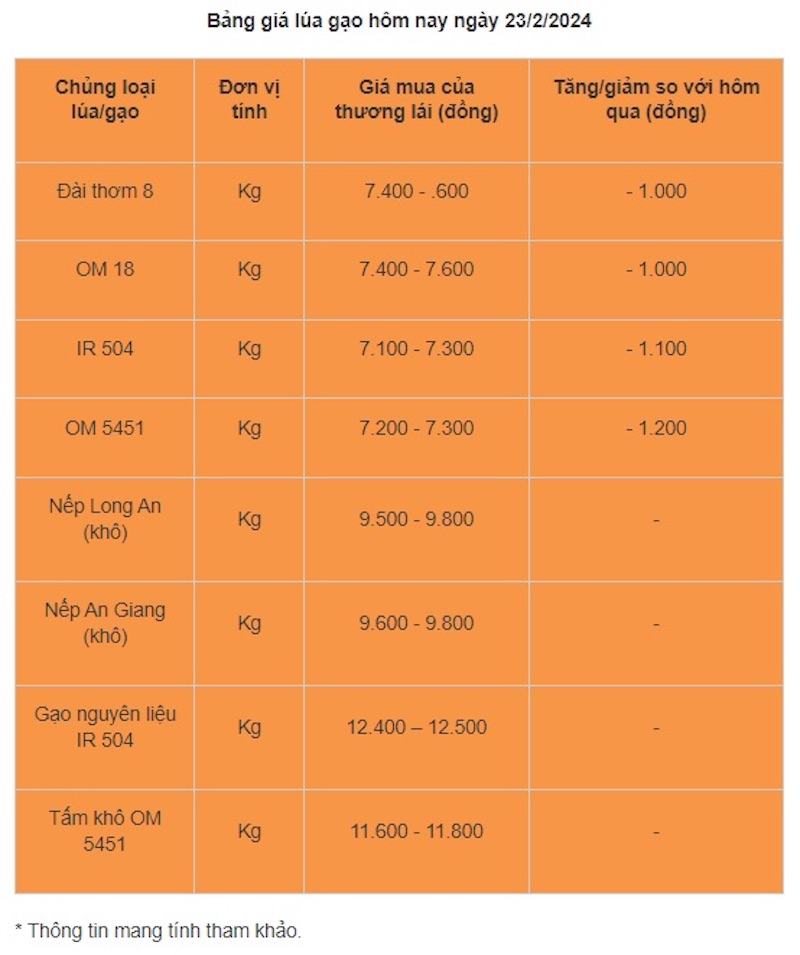 Cụ thể, giá lúa IR 504 ở mức 7.100 – 7.300 đồng/kg, giảm 1.100 đồng/kg; lúa Đài thơm 8 ở mức 7.400 – 7.600 đồng/kg, giảm 1.000 đồng/kg; lúa OM 18 ở mức 7.400 – 7.600 đồng/kg, giảm 1.000 đồng/kg; lúa OM 5451 ở mức 7.200 – 7.300 đồng/kg, giảm 1.200 đồng/kg; Lúa Nhật 7.800 – 8.000 đồng/kg.