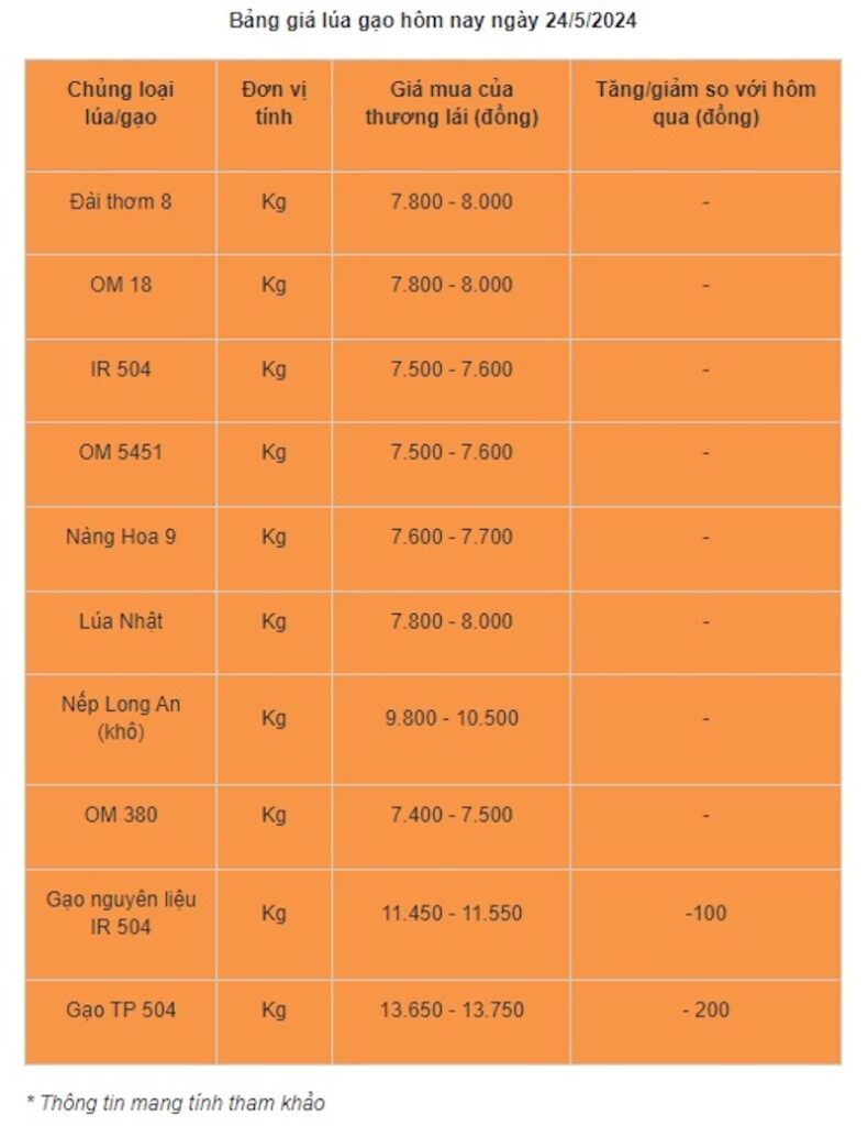 Với mặt hàng lúa hôm nay không có biến động. Cụ thể, theo cập nhật từ Sở Nông nghiệp và Phát triển nông thôn tỉnh An Giang, lúa IR 504 ổn định ở mức 7.500-7.600 đồng/kg; lúa OM 5451 duy trì quanh mức 7.600 – 7.700 đồng/kg; lúa OM 380 ở mốc 7.500 – 7.600 đồng/kg; Lúa Đài thơm 8 duy trì ở mức 7.800 – 8.000 đồng/kg; Nàng Hoa 9 ở mức 7.600 – 7.700 đồng/kg; Lúa Nhật giá 7.800 – 8.000 đồng/kg; OM 18 ở mức 7.800 – 8.000 đồng/kg; giá Nếp Long An dao động quanh mức 9.800 – 10.500 đồng/kg; Nàng Nhen khô 20.000 đồng/kg.