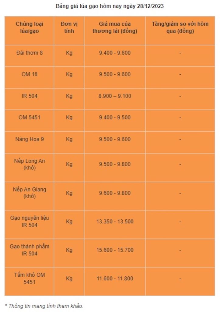Giá lúa gạo hôm nay ngày 28/12 tại Đồng bằng sông Cửu Long không có biến động so với hôm qua. Hiện giá lúa gạo neo cao khiến doanh nghiệp không mua được hàng.