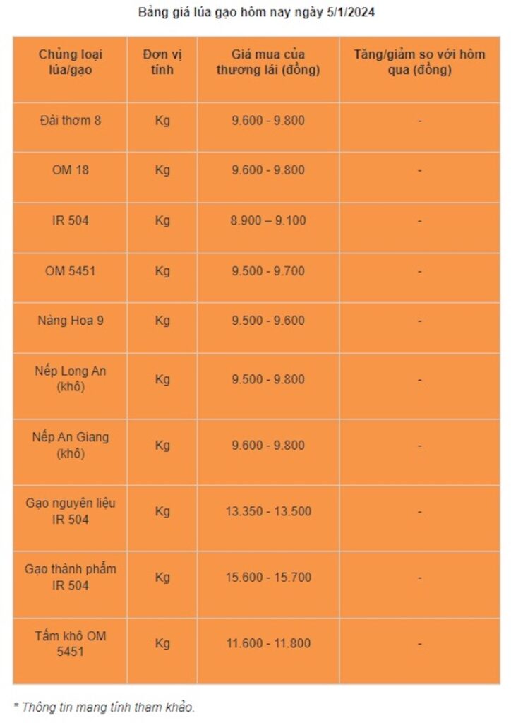 Với lúa, theo cập nhật của Sở Nông nghiệp và Phát triển nông thôn tỉnh An Giang, giá lúa IR 504 ở mức 8.900 – 9.100 đồng/kg; lúa Đài thơm 8 duy trì quanh mốc 9.600 – 9.800 đồng/kg; OM 18 ở mức 9.600 – 9.800 đồng/kg; OM 5451 ở mức 9.500 – 9.700 đồng/kg; Nàng Hoa 9 duy trì ổn định ở mức 9.500 – 9.600 đồng/kg; lúa OM 380 dao động quanh mốc 8.600 – 8.800 đồng/kg.