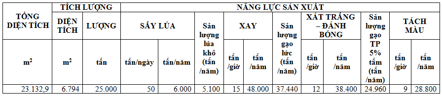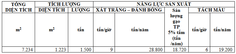 Diện tích chứa hàng: 6.794 m2, bao gồm kho và 16 silo với tổng sức chứa là 25.000 tấn, xây dựng năm 1988. Năng lực xay xát: gồm 02 dây máy Xay-Xát-Lau bóng với tổng năng suất 15 tấn lúa/giờ. Ngoài ra còn có máy sấy tháp năng suất 25 tấn lúa/giờ, giảm được từ 1,0 – 1,5 % độ ẩm và 02 máy tách màu: 01 máy năng suất 3 tấn/giờ lắp đặt năm 2008 và 01 máy năng suất 6 tấn/giờ lắp đặt năm 2011.